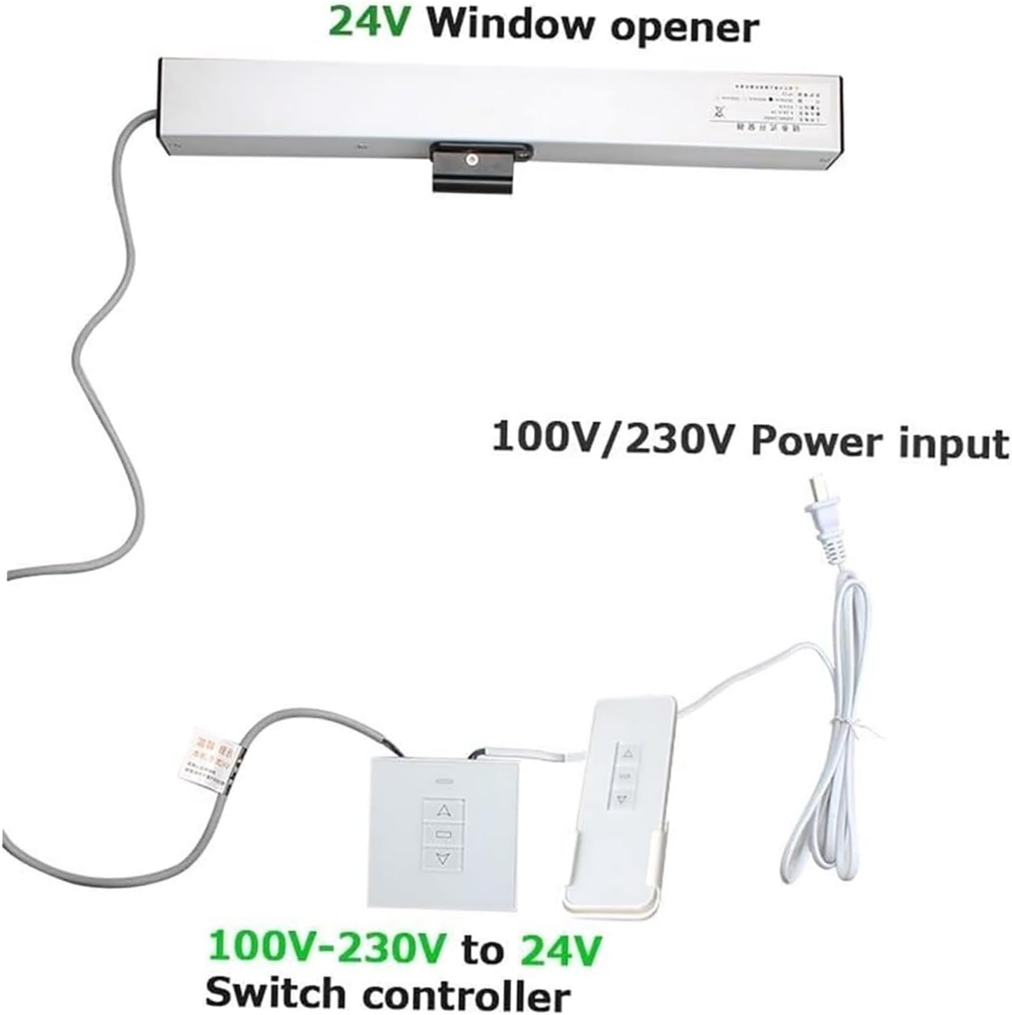 This automatic window opener is designed to provide convenient remote control operation for various window types, featuring a 24V motor with stable 400N push and pull force and double layer metal chain for smooth and reliable performance, the low noise design ensures quiet operation while the built in overload protection enhances safety by automatically stopping when reaching force limits, with multiple stroke options and flexible installation methods it is suitable for skylights greenhouse windows roof vents and sliding windows, the durable aluminum alloy body and stainless steel chain support long term use, making it ideal for home automation setups and users who need easier window control in daily environments. Product Specifications: Voltage: DC 24V Working Current: 1A Push and Pull Force: 400N Speed: 10 mm/s Stroke Options: 300mm / 400mm / 500mm / 600mm / 700mm / 800mm / 1000mm Protection Level: IP32 Working Temperature: -10℃ to 75℃ Material: Aluminum Alloy Body + Stainless Steel Chain Installation Type: Multiple window types (skylight sliding top hung bottom hung) Package Includes: 1 × window opener, 1 × remote control