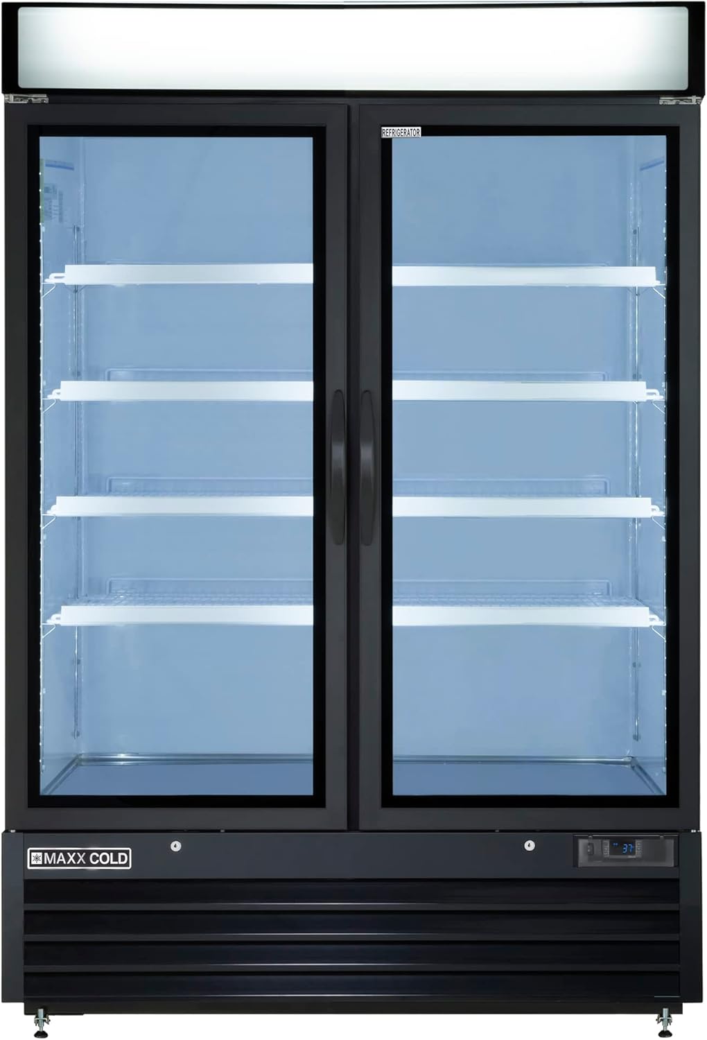 Maxx Cold two section glass merchandiser refrigerator with self-closing swing doors is ideal for displaying a wide variety of beverages, storing take-out food as well as increasing impulse sales. The double door merchandiser utilizes environmentally friendly R290 refrigerant and designed with energy efficient components, the model is one of the only Energy Star certified merchandisers available. The bright white LED interior lighting illuminates the cabinet interior and the double pane heated glass doors prevent fog and reduce condensation always providing end users and operators quick access and visibility. The double doors conveniently swing open for quick access then automatically close, and seal shut with the robust magnetic door gaskets. The powerful compressor, thick and efficient foamed-in-place insulation, and precise digital temperature controller keep all your beverages such as soda, beer, energy drinks, milk and juice at the exact temperature. Additional features include heavy duty coated shelves with stainless steel shelf clips, standard door locks, and adjustable feet. Merchandisers are constructed of high quality commercial components and materials that meet strict UL and NSF commercial standards. Glass door merchandisers can be installed at any restaurant, take-out establishment, convenience store, hotel, concession stand, deli, café, gym & fitness center, grocery or retail store and can even be installed in your home kitchen, game room and garage.