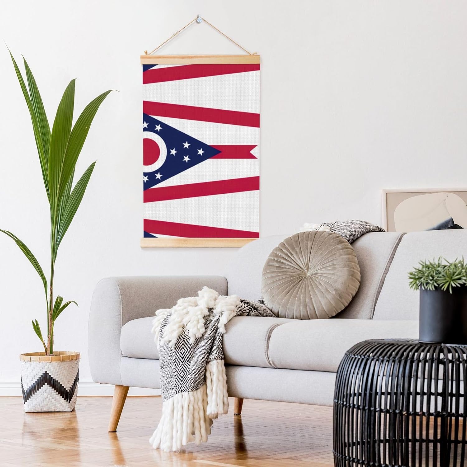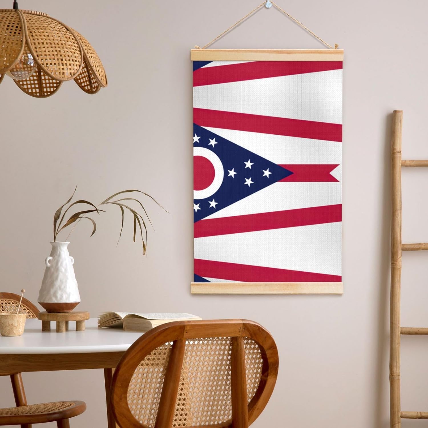 Our Ohio State Flag Print Wooden Poster Hanger Is An Excellent Addition To Your Home Decor Or A Perfect Gift For Friends And Family. Made Of Selected Quality Canvas With Brilliant And Enduring Colors, This Wall Art Is Designed To Resist Water, Dust, And Fading, Ensuring The Bright And Vibrant Art Lasts. The Polyester Is Enclosed Between Two Teak Wood Hanger Scrolls With An Attached 35cm Rope For Easy Hanging. Installation Is Made Simple With The Included Two Nails In A Plastic Box. The Modern Minimalist Style Of Our Wall Hanging Complements Any Home Decor, Elevating The Artistic Ambiance And Brightening Up The Room. Experience The Elegant Transformation This Wall Hanging Scroll Painting Brings To Your Spaces Today.