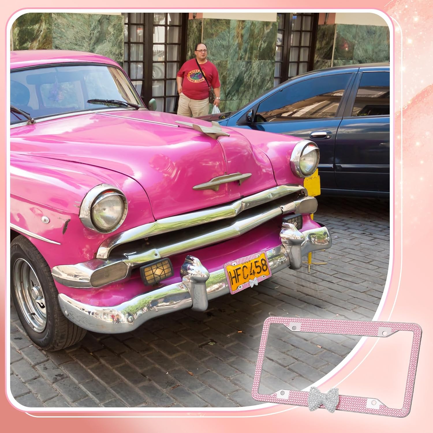 Features: These adorable additions integrate seamlessly, enhancing your vehicle's interior with a subtle yet luxurious sparkle. The pink stainless steel frame adorned with shiny rhinestones transforms any car into a statement of elegance and charm. Specifications: Material: stainless steel Color: pink Size: License Plate Frames: approximately 12 x 6 inches Package includes: 2XLicense plate frames 4XCar tire valve stem caps 2XEngine start stop decoration ring Notes: Manual measurement, please allow slight errors on size. The color may exist a slight difference due to different screen displays.
