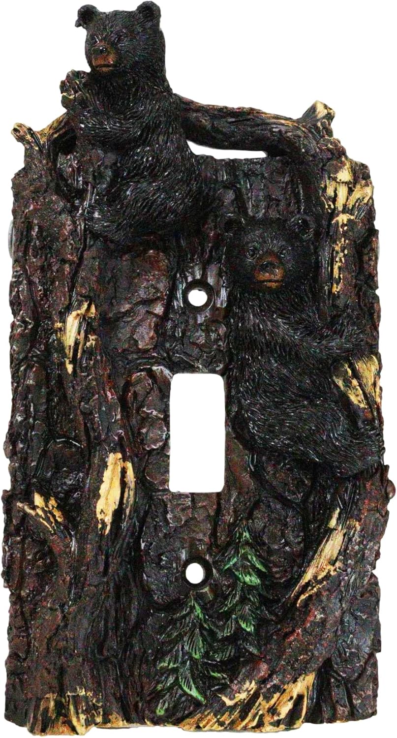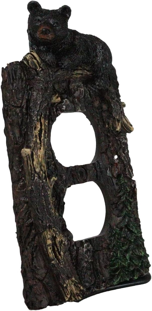 It is now very easy to transform your space at your home or office into a rustic Western exotic getaway with these black bear family electrical cover plates. This particular electrical plate cover features 2 black bears climbing up a tree trunk and branch. With a touch of greenery and woodsy brown texture, this wall plate exudes rustic western flair.