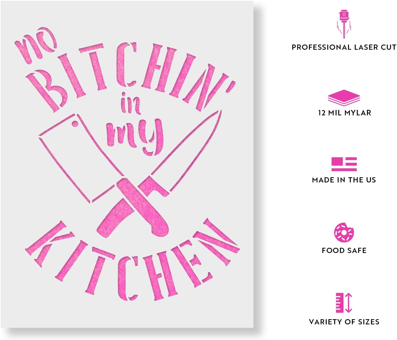 Imagine the fun of unleashing these stencils on your canvas, wood, or walls. You'll be the Picasso of the neighborhood, creating masterpieces that will leave everyone in stitches (figuratively, of course). These stencils aren't just for painting; they're your ticket to becoming the neighborhood's stencil superhero!With these stencils by your side, painting, drawing, and spray painting become delightful adventures. Whether you're creating on canvas, wood, or walls, the no bitchin in my kitchen sign stencil brings a touch of enchantment to your projects. They're not just stencils; they're portals to a world of creativity.