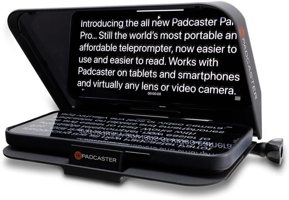 The All-In-One Video Production Studio Teleprompter Kit for Apple iPad Pro 9.7-12.9" is a comprehensive solution designed to transform your iPad into a mobile production suite. Ideal for schools, broadcast journalists, and businesses of all sizes, the Padcaster Studio empowers you to produce professional-grade videos from any location. The heart of the studio is the newly designed Padcaster Case. Constructed from anodized aluminum, this adjustable case securely accommodates any iPad model, from the expansive 12.9" iPad Pro to the classic 9.7" iPads, and even a range of popular non-Apple tablets. The Padcaster Case is the ultimate tablet support, offering versatility and security while enabling the attachment of a plethora of video production accessories to enhance your content quality.The Padcaster Studio comes with an extensive selection of audio and video accessories. The audio suite includes three distinct microphones: a handheld Stick Microphone, a clip-on Lavalier Microphone, and a camera-mounted Mini Microphone. Each microphone is designed to capture high-quality audio in different filming scenarios. The studio also includes a Stereo Headset with a swing-out mic and a wireless Bluetooth headset for sound monitoring and recording. A Dual Microphone/Headphone Splitter with lightning and USB-C dongles ensures seamless connectivity of your audio devices to your iPad.The Padcaster Parrot Teleprompter Kit, renowned as the world's most portable teleprom