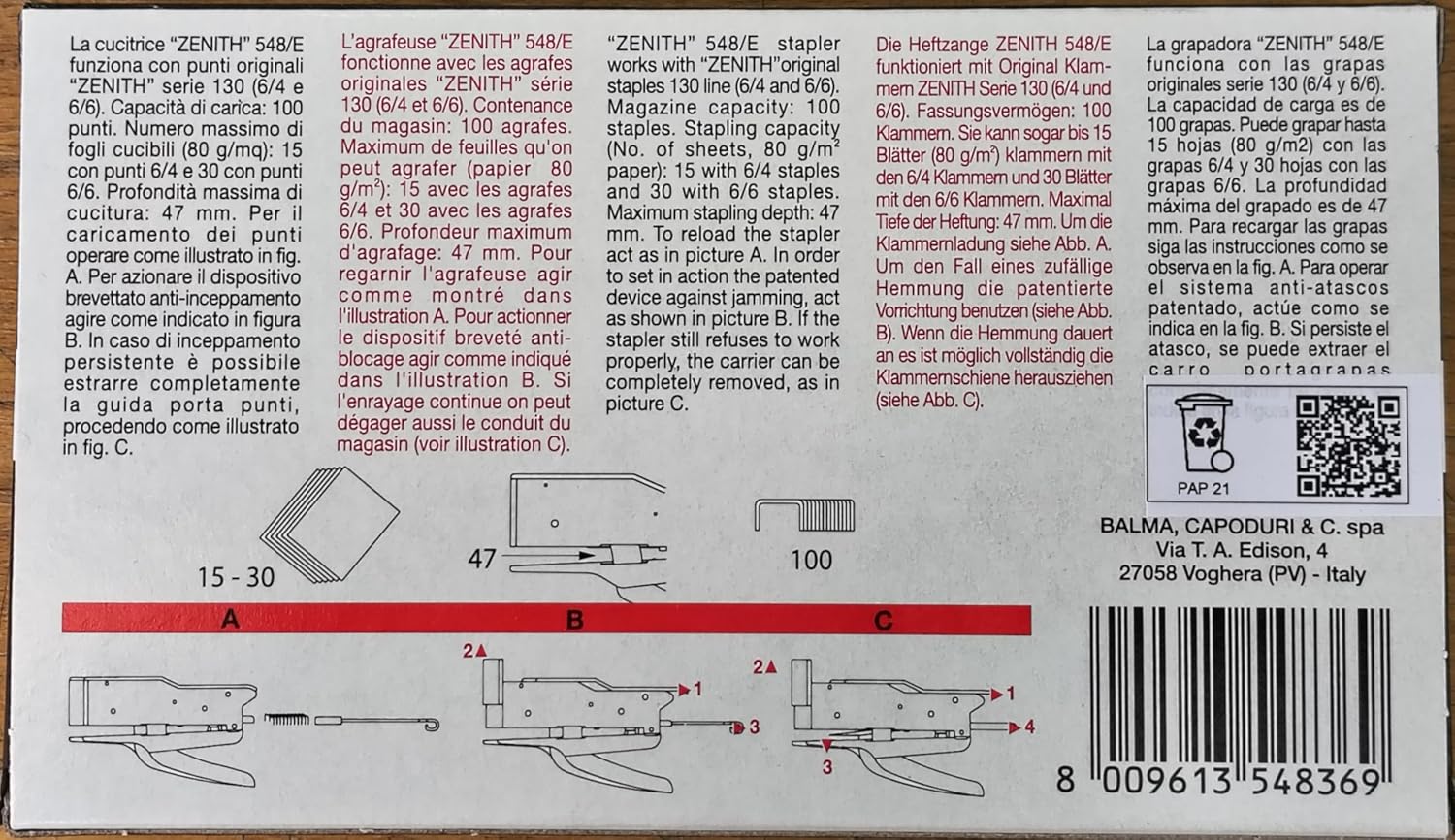 Stapler Pliers 548/E - 6/4-6/6 Anti-blocking device. Mechanism and metal body. Stapling: 15 sheets 6/4 - 30 sheets 6/6. Capacity: 100 staples 6/4 - 6/6. Throat Depth: 47mm Comes with a box of 6/4 staples. In an individual box.